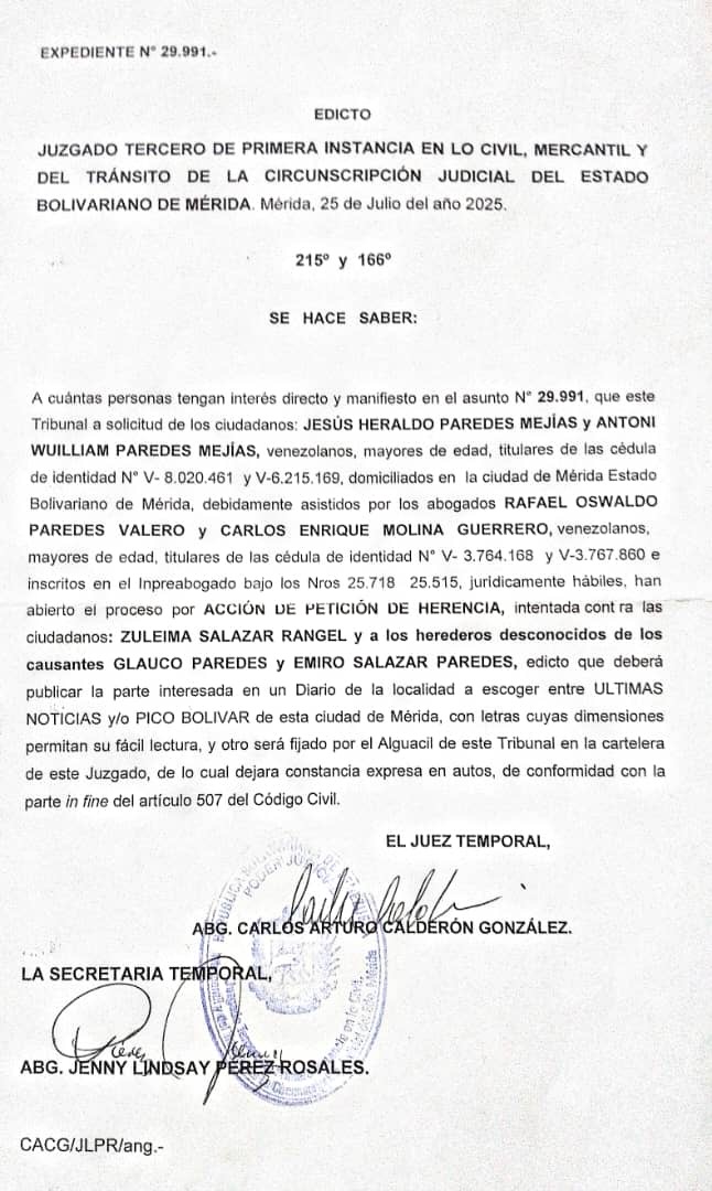 Edicto mediante el cual se notifica a las personas con interés directo en el asunto N° 29.991, sobre acción de petición de herencia promovida por Jesús Heraldo Paredes Mejías y Antoni William Paredes Mejías contra Zuleima Salazar Rangel y los herederos desconocidos de los causantes Glauco Paredes y Emiro Salazar Paredes. (08/10/2025)
