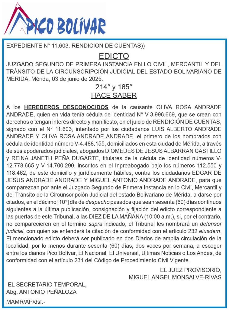 Edicto: Se hace saber a los herederos desconocidos de la causante OLIVA ROSA ANDRADE ANDRADE, que se crean con derechos o tengan interés directo y manifiesto, en el juicio de RENDICION DE CUENTAS, signado con el N° 11.603 (20/08/2025)