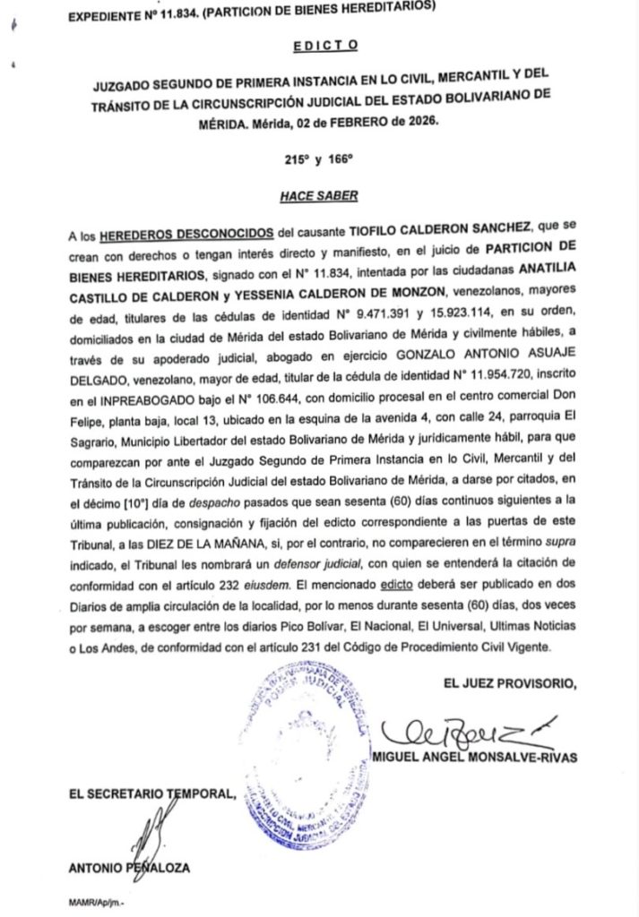 EDICTO. Se hace saber a los HEREDEROS DESCONOCIDOS del causante TIOFILO CALDERON SANCHEZ, que se crean con derechos o tengan interés directo y manifiesto, en el juicio de PARTICION DE BIENES HEREDITARIOS (14-02-2026)