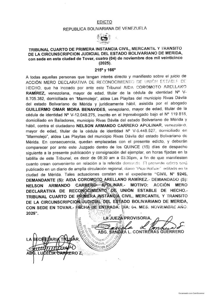 EDICTO SE HACE SABER: A quienes tengan interés en el juicio de ACCIÓN MERO DECLARATIVA DE RECONOCIMIENTO DE UNIÓN ESTABLE DE HECHO, promovido por AIDA COROMOTO ARELLANO RAMÍREZ, cédula de identidad N° V-8.705.382. (21-04-2026)
