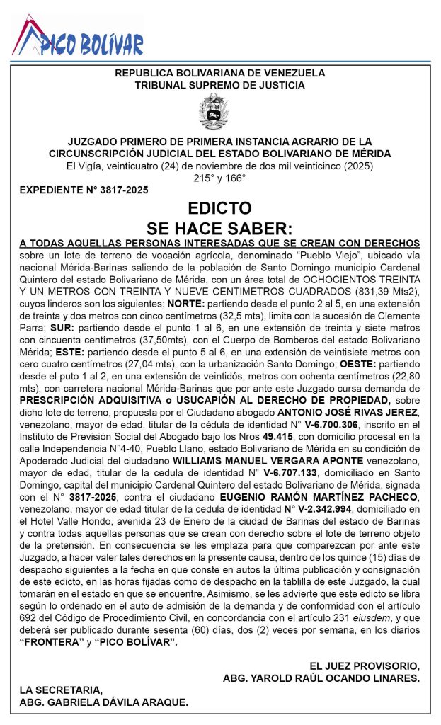 Edicto: Se hace saber a todas aquellas personas interesadas que se crean con derechos sobre lote de terreno de vocación agrícola denominado “Pueblo Viejo”, ubicado en Santo Domingo, municipio Cardenal Quintero del estado Mérida, objeto de demanda de prescripción adquisitiva(25-03-2026)