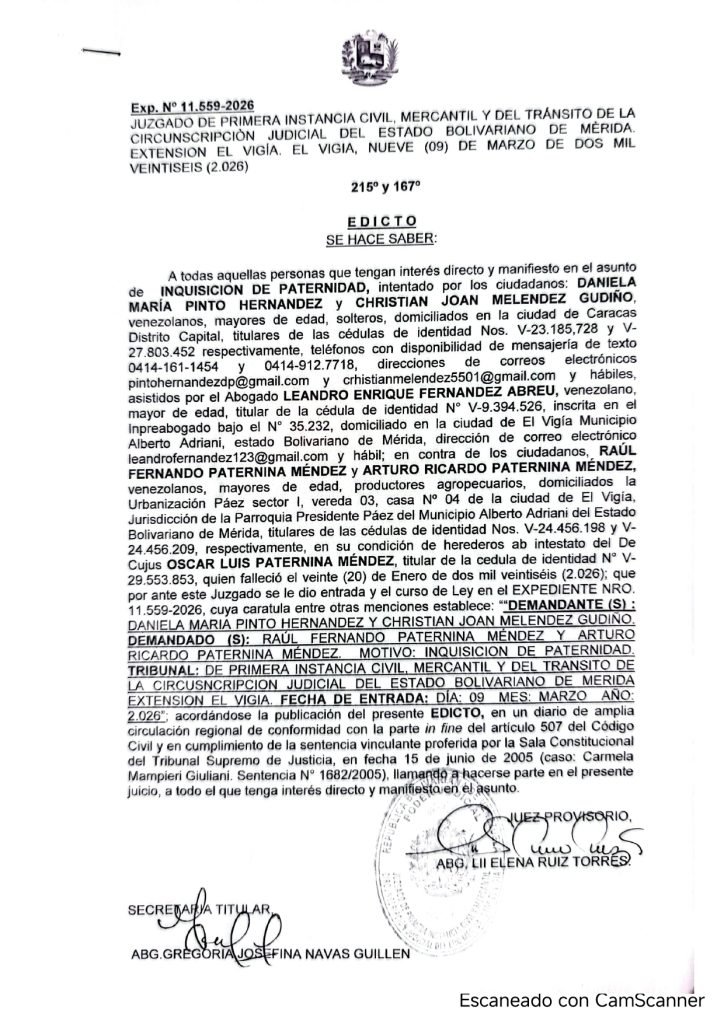Home Avisos LegalesEdicto Se Hace Saber A Todas Aquellas Personas Que Tengan Interés Directo Y Manifiesto En El Asunto De Inquisición De Paternidad Intentado Por Los Ciudadanos Daniela María Pinto Hernández Y Christian Joan Meléndez Gudiño Contra Los Ciudadanos Fernando Paternina Méndez Y Arturo Ricardo Paternina Méndez, Herederos Del De Cujus Oscar Luis Paternina Méndez(07-04-2026)