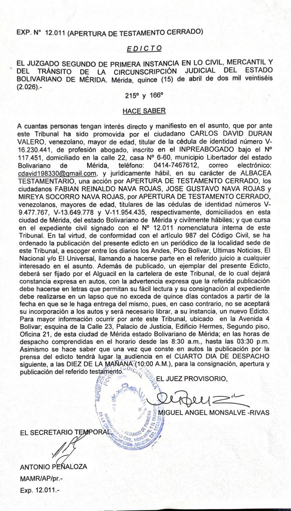 Home Avisos LegalesEdicto se hace saber a todas las personas con interés directo y manifiesto que ha sido promovida acción por apertura de testamento cerrado por el ciudadano Carlos David Durán Valero, en su carácter de albacea testamentario, en relación con los ciudadanos Fabián Reinaldo Nava Rojas, José Gustavo Nava Rojas y Mireya Socorro Nava Rojas, según expediente N° 12.011, ordenándose su publicación y llamado a interesados conforme a derecho. (17-04-2026)