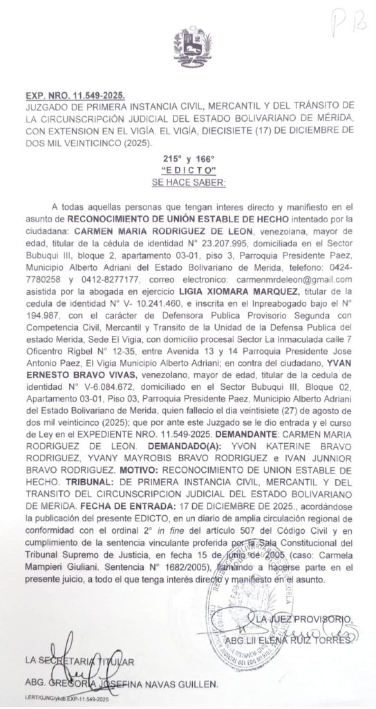 «EDICTO» SE HACE SABER:A todas aquellas personas que tengan interes directo y manifiesto en el asunto de RECONOCIMIENTO DE UNIÓN ESTABLE DE HECHO intentado por la ciudadana: CARMEN MARIA RODRIGUEZ DE LEON, cédula de identidad N° 23.207.995