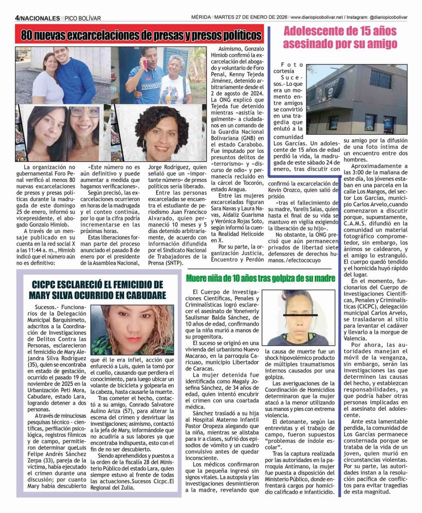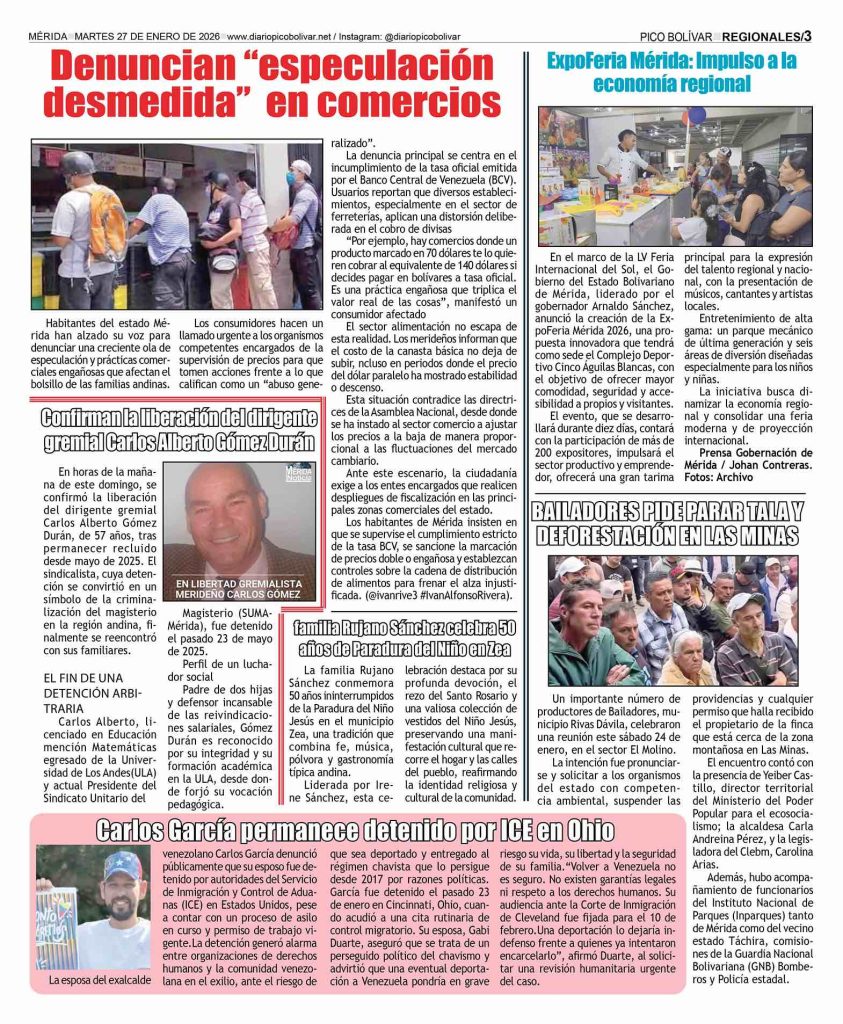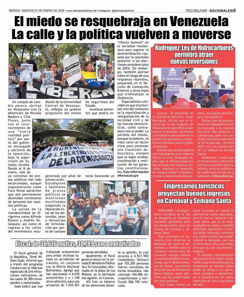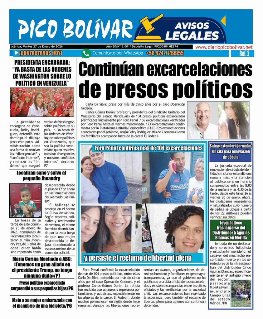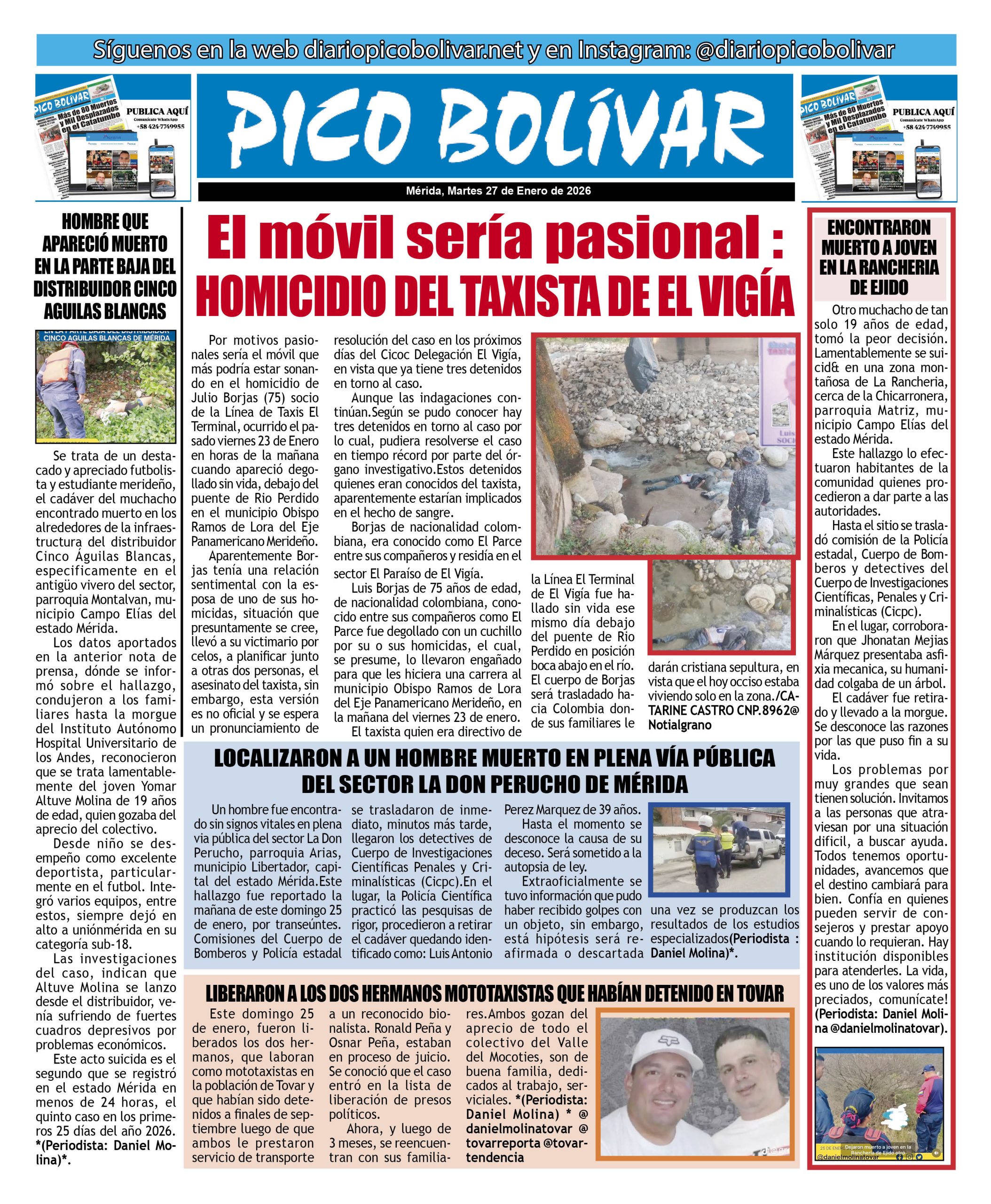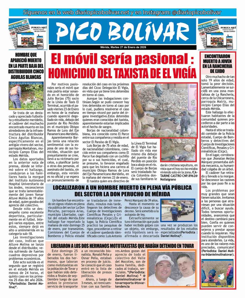 Edición impresa Él Impreso por Redacción web 26 de enero de 2026 escrito por Redacción web 26 de enero de 2026 39 0 comentarios 0 FacebookTwitterPinterestEmail Redacción web publicación anterior LIBERARON A LOS DOS HERMANOS MOTOTAXISTAS QUE HABÍAN DETENIDO EN TOVAR publicación siguiente Magallanes avanza a la final tras vencer a Bravos de Margarita Related Articles Él Impreso 19 de enero de 2026 +584147441329 04247749955 PUBLICIDAD 9 de enero de 2026