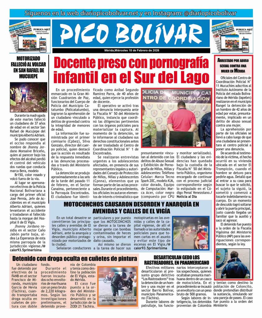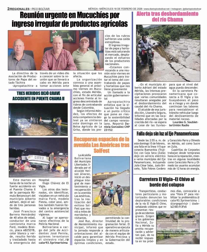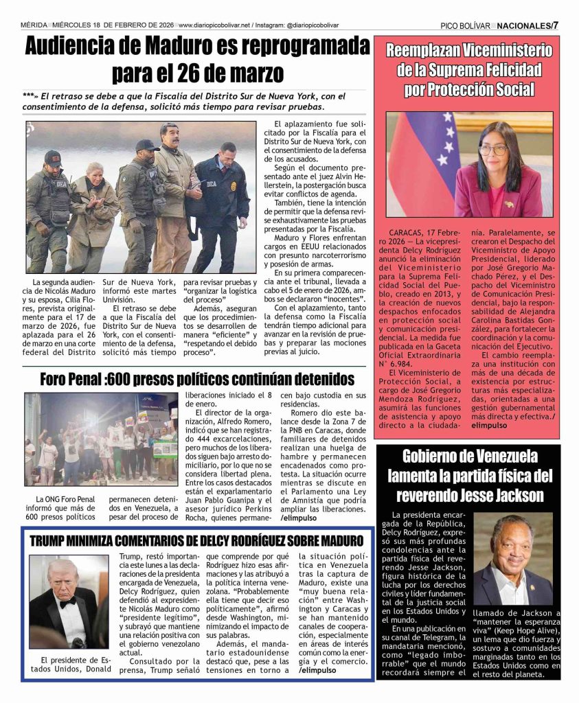 Nacionales El Impreso por Redacción web 18 de febrero de 2026 escrito por Redacción web 18 de febrero de 2026 9 0 comentarios 0 FacebookTwitterPinterestEmail Redacción web publicación anterior Audiencia de Maduro es reprogramada para el 26 de marzo publicación siguiente UN MUERTO Y DOS HERIDOS DEJÓ GRAVE ACCIDENTE EN CAÑO AMARILLO DEL TÁCHIRA Related Articles Gasolina de 97 octanos regresa a Venezuela 17 de febrero de 2026 ¡Enterrada en su propio patio ! periodista Kalinina... 17 de febrero de 2026 Juegos de Carnaval terminan en violencia: Lanzaron una... 16 de febrero de 2026 UNA REVELACIÓN DE SEXO TERMINA CON UN VORAZ... 16 de febrero de 2026 Crecida del río Guanare arrasó con las tarimas que... 16 de febrero de 2026 Imputaron a mujer vinculada al polémico caso de... 15 de febrero de 2026 Delcy Rodríguez elimina siete entes públicos, entre misiones... 15 de febrero de 2026 Agradecida con Dios»: Karol G celebra sus 35... 15 de febrero de 2026 Secretario Wright dice que lo que dijo María... 14 de febrero de 2026 Despliegue Carnavales 2026: 228 mil funcionarios al servicio... 14 de febrero de 2026
