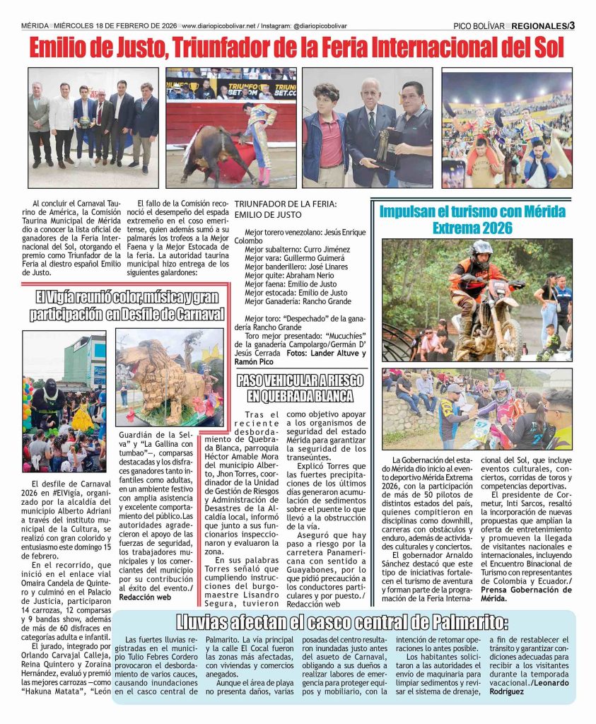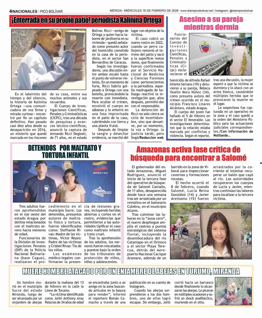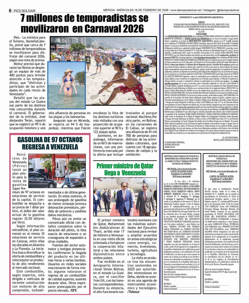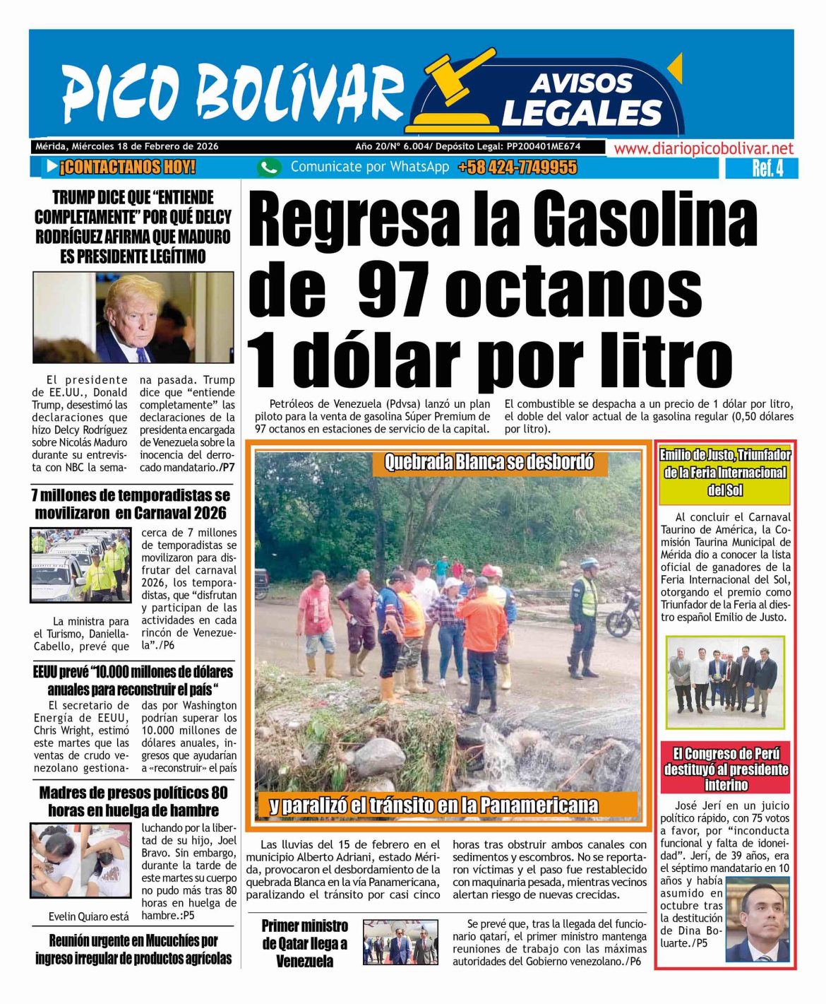 Nacionales El Impreso por Redacción web 18 de febrero de 2026 escrito por Redacción web 18 de febrero de 2026 9 0 comentarios 0 FacebookTwitterPinterestEmail Redacción web publicación anterior Audiencia de Maduro es reprogramada para el 26 de marzo publicación siguiente UN MUERTO Y DOS HERIDOS DEJÓ GRAVE ACCIDENTE EN CAÑO AMARILLO DEL TÁCHIRA Related Articles Gasolina de 97 octanos regresa a Venezuela 17 de febrero de 2026 ¡Enterrada en su propio patio ! periodista Kalinina... 17 de febrero de 2026 Juegos de Carnaval terminan en violencia: Lanzaron una... 16 de febrero de 2026 UNA REVELACIÓN DE SEXO TERMINA CON UN VORAZ... 16 de febrero de 2026 Crecida del río Guanare arrasó con las tarimas que... 16 de febrero de 2026 Imputaron a mujer vinculada al polémico caso de... 15 de febrero de 2026 Delcy Rodríguez elimina siete entes públicos, entre misiones... 15 de febrero de 2026 Agradecida con Dios»: Karol G celebra sus 35... 15 de febrero de 2026 Secretario Wright dice que lo que dijo María... 14 de febrero de 2026 Despliegue Carnavales 2026: 228 mil funcionarios al servicio... 14 de febrero de 2026
