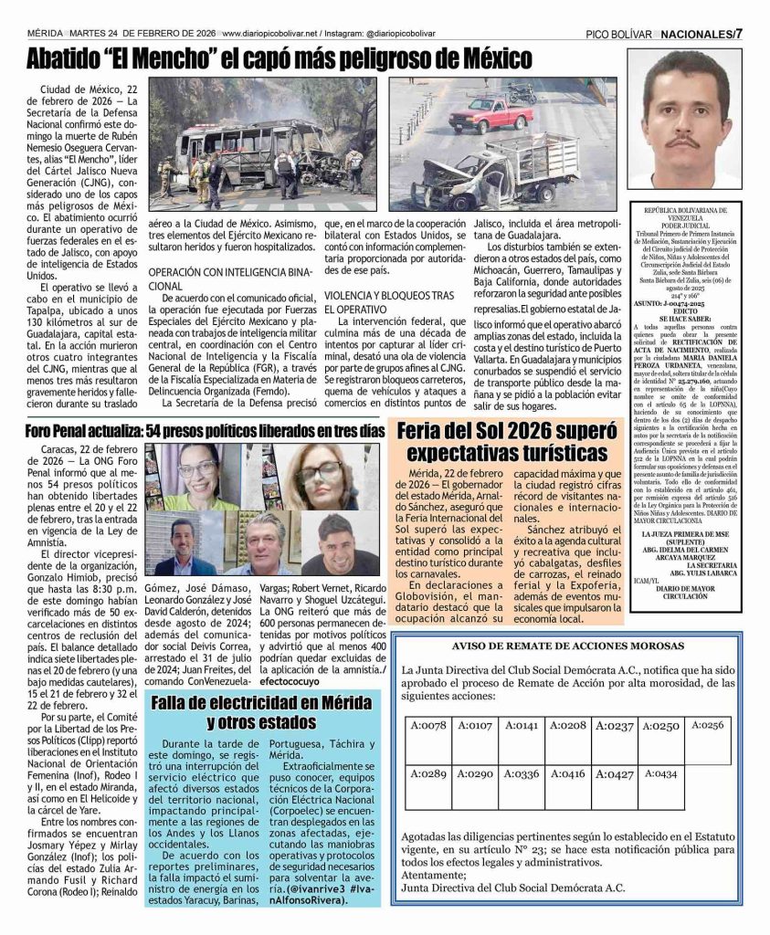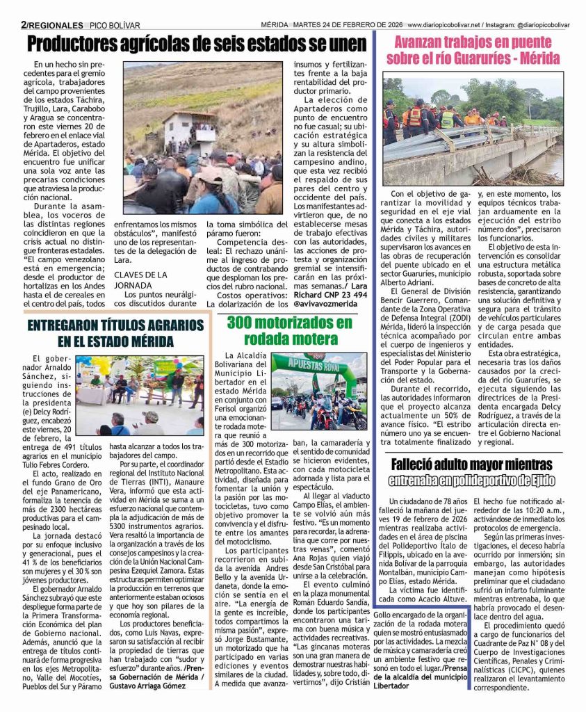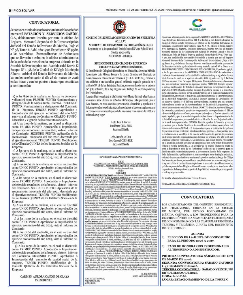 Regionales Él Impreso por Redacción web 23 de febrero de 2026 escrito por Redacción web 23 de febrero de 2026 12 0 comentarios 0 FacebookTwitterPinterestEmail Redacción web publicación anterior EDICTO. Se hace saber a todas aquellas personas que se crean con derecho de propiedad sobre un inmueble consistente en un lote de terreno que forma parte de uno de mayor extensión ubicado a la margen derecha de la actual Avenida Táchira, antigua Carretera Transandina que conduce de Tovar a Bailadores, en el sitio denominado El Llano de los Higuerones, más abajo de la antigua Residencia Vargas, signada con el N° 48, hoy parroquia El Llano, jurisdicción del municipio Tovar del estado Bolivariano de Mérida (23-02-2026) publicación siguiente Él Impreso Avisos Legales Related Articles Más de 300 motorizados celebran rodada motera en... 22 de febrero de 2026 Entregaron títulos agrarios en el estado Mérida 22 de febrero de 2026 UNA JOVEN MUERTA Y UN HERIDO DEJO ACCIDENTE... 21 de febrero de 2026 Agricultores en Mérida, denuncian que el contrabando ‘masacra’... 20 de febrero de 2026 HABILITADO PUENTE QUEBRADA LA VIRGEN EN LA VÍA... 20 de febrero de 2026 Exhortan a la ciudadanía a denunciar irregularidades para... 20 de febrero de 2026 Gandola cargada con caña de azúcar volcó, en Apartaderos 20 de febrero de 2026 ¡Agricultores de Táchira, Mérida, Trujillo y Barinas,en pie... 20 de febrero de 2026 El dirigente merideño Villca Fernández recibe orden de... 20 de febrero de 2026 PASO HACIA LA PALMITA SE MANTIENE RESTRINGIDO PARA... 20 de febrero de 2026