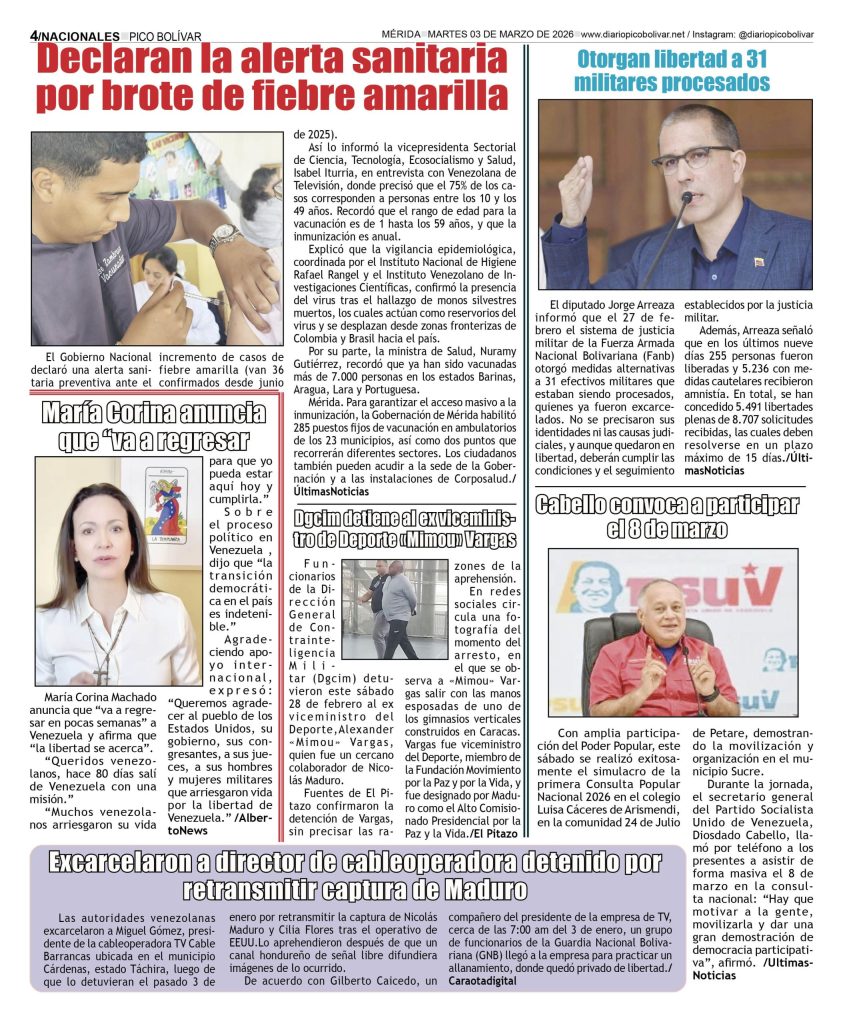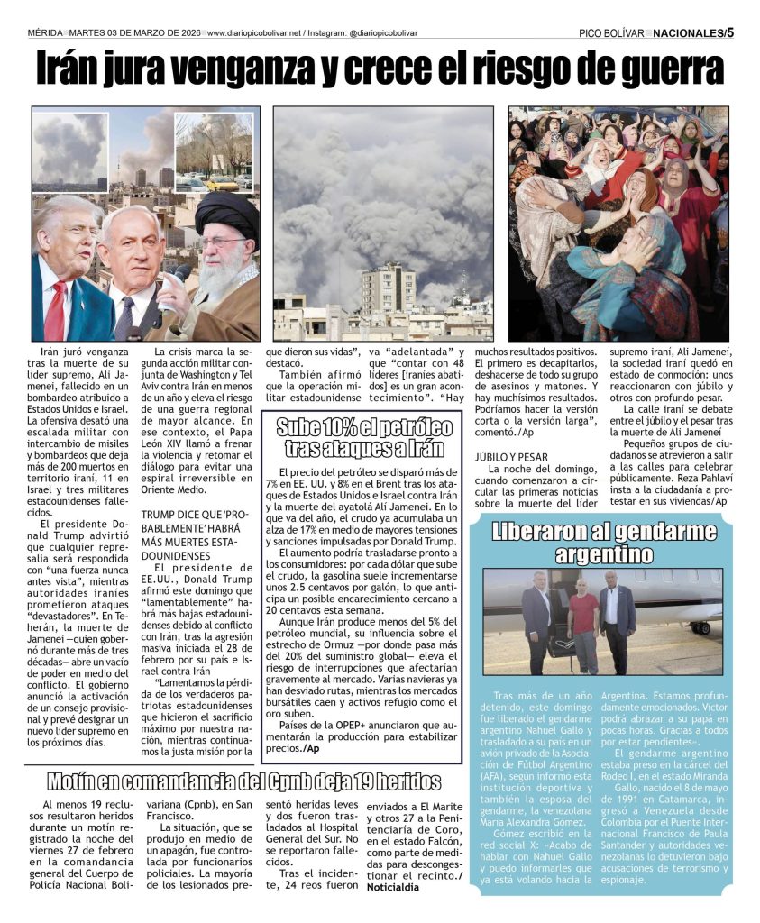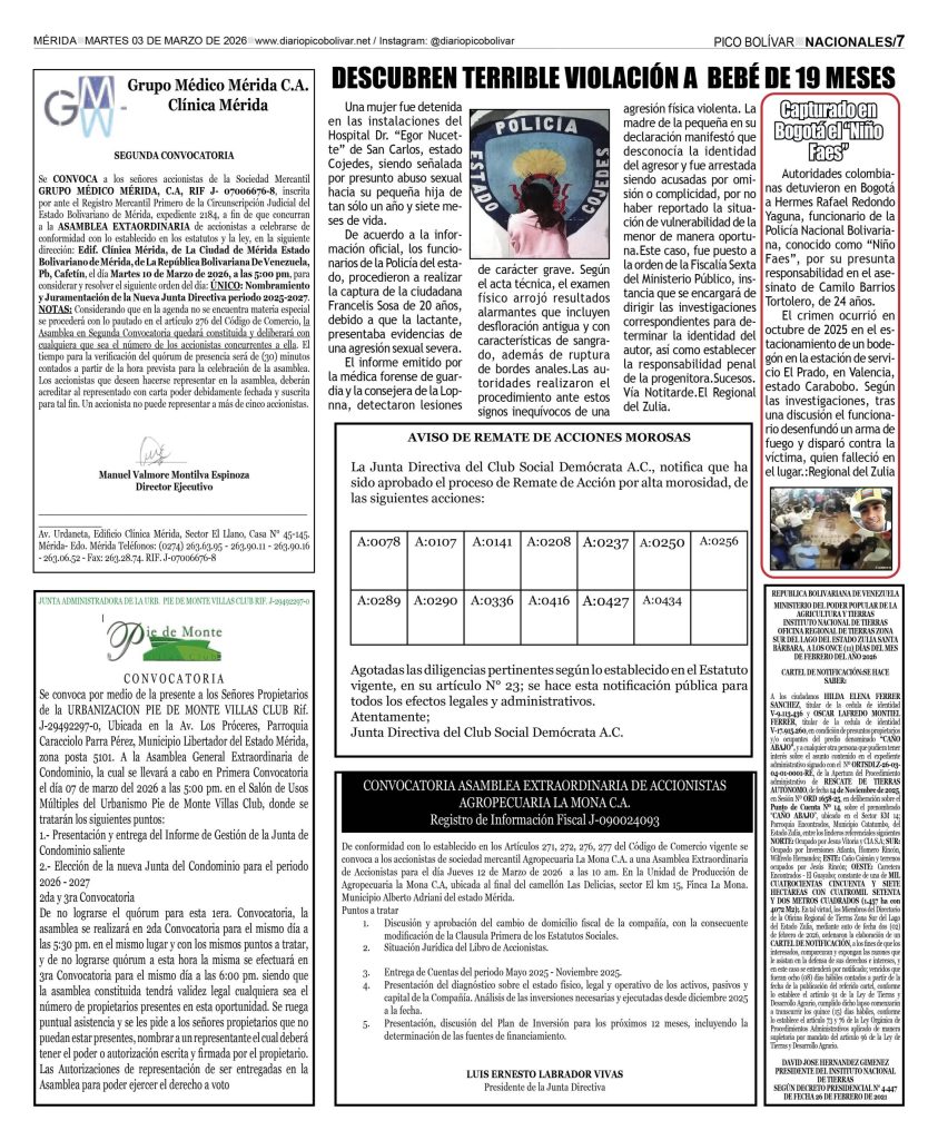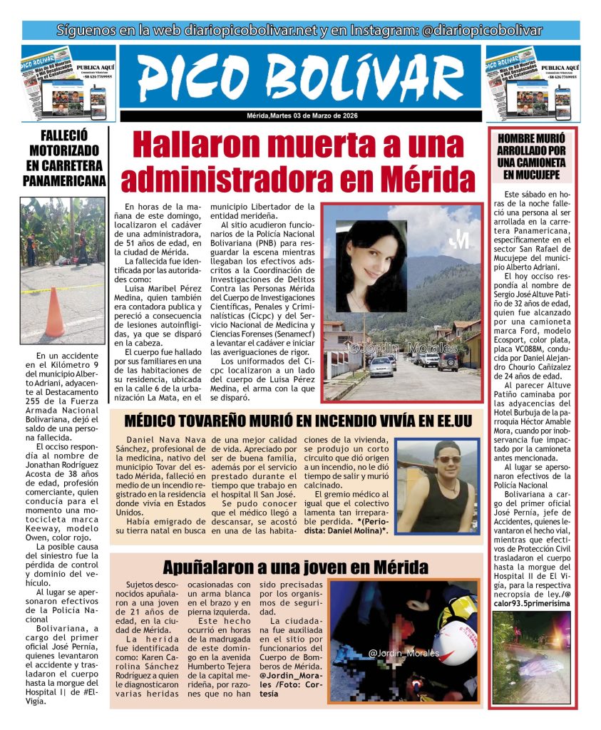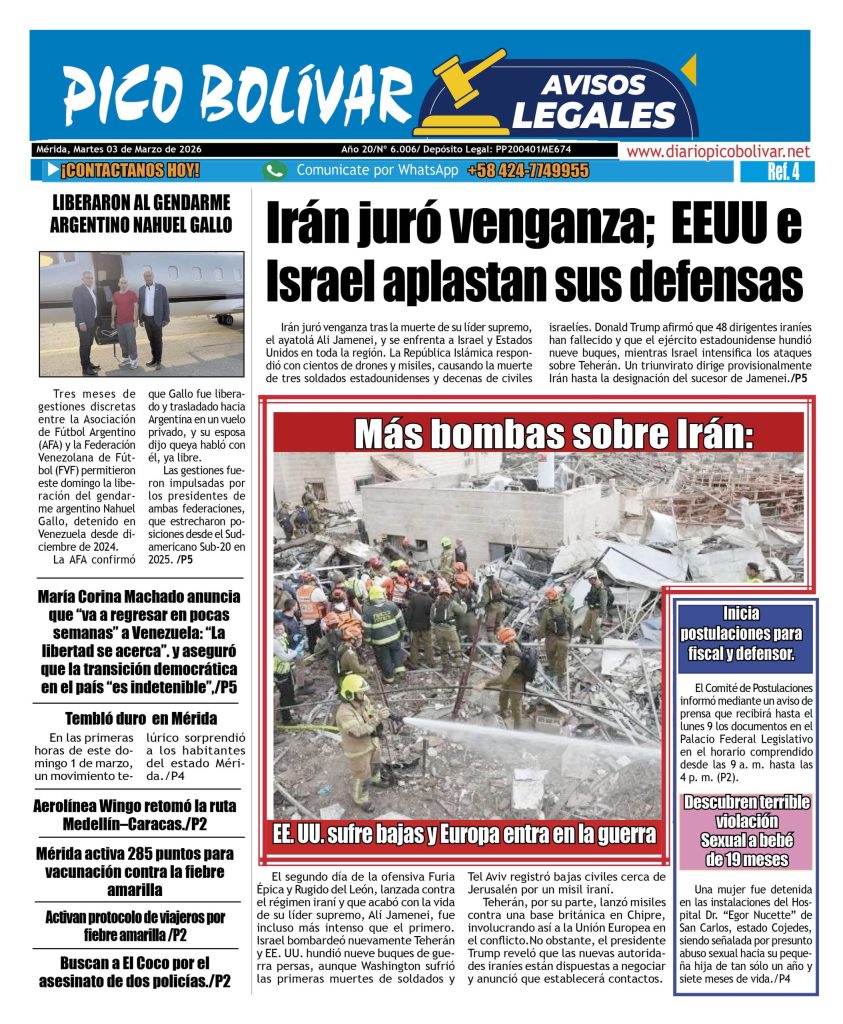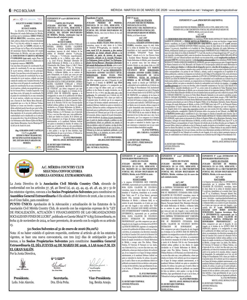 Nacionales Él Impreso por Redacción web 2 de marzo de 2026 escrito por Redacción web 2 de marzo de 2026 13 0 comentarios 0 FacebookTwitterPinterestEmail Redacción web publicación anterior Edicto. Se hace saber a los HEREDEROS DESCONOCIDOS DE LOS CAUSANTES FRANCISCO BRICEÑO PINO y MAURICIA DE BRICEÑO, titulares de las cédulas de identidad Nros V-661 517 y V-661 492 y a todas aquellas personas que se crean con derechos en el juicio de PRESCRIPCION ADQUISITIVA contra los HEREDEROS DESCONOCIDOS DE LOS CAUSANTES FRANCISCO BRICEÑO PINO Y MAURICIA DE BRICEÑO (02-03-2026) publicación siguiente Localizaron muerta a la joven que fue arrastrada por el río Chama en Lagunillas Related Articles Irán jura venganza; EEUU e Israel aplastan sus... 2 de marzo de 2026 Inician postulaciones para fiscal y defensor 2 de marzo de 2026 Buscan a “El Coco” por el asesinato de... 2 de marzo de 2026 LOCALIZADA CIUDADANA FALLECIDA EN EL INTERIOR DE SU... 1 de marzo de 2026 Irán confirma la muerte del ayatolá Alí Jameneí 1 de marzo de 2026 Trump confirma la muerte del líder supremo iraní... 28 de febrero de 2026 Gobierno anuncia la excarcelación de 31 militares 28 de febrero de 2026 ÚLTIMA HORA | ATAQUE A IRÁN Israel y... 28 de febrero de 2026 Al menos 15 muertos al estrellarse un avión... 27 de febrero de 2026 Cadáver de madre venezolana fue hallado dentro de... 27 de febrero de 2026
