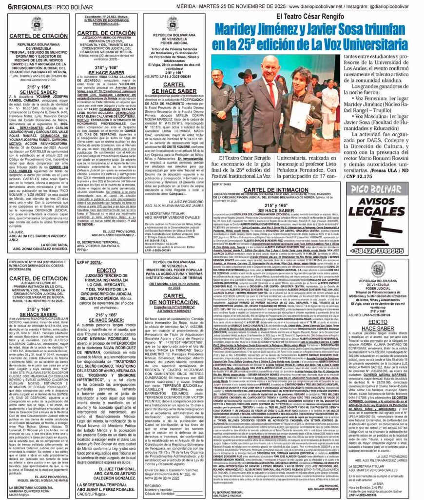 Avisos Legales Él Impreso Avisos Legales por Redacción web 25 de noviembre de 2025 escrito por Redacción web 25 de noviembre de 2025 4 0 comentarios 0 FacebookTwitterPinterestEmail Redacción web publicación anterior Emiten orden de arresto contra dueña de Miss Universe publicación siguiente Gobierno y aerolíneas buscan garantizar continuidad de vuelos Related Articles PRESCRIPCIÓN ADQUISITIVA – EDICTO Se hace saber que... 24 de noviembre de 2025 SE HACE SABER: A la ciudadana PAOLA PATRICIA... 24 de noviembre de 2025 EDICTO Se hace saber a los herederos desconocidos del... 24 de noviembre de 2025 CARTEL DE NOTIFICACIÓN A la Ciudadana ANYOLINY DEL... 23 de noviembre de 2025 Tribunal Quinto de Municipio Ordinario y Ejecutor de... 23 de noviembre de 2025 CARTEL DE CITACIÓN Al ciudadano ADELXO ROJAS ROJAS,... 22 de noviembre de 2025 Cartel de Citación al ciudadano FREDY ROJAS DUGARTE,... 22 de noviembre de 2025 Cartel de Citación a la ciudadana CARMEN AURORA... 22 de noviembre de 2025 Cartel de citación a la ciudadana MARIA MATILDE... 22 de noviembre de 2025 CARTEL DE INTIMACIÓN Al ciudadano PEDRO ANTONIO VELAZCO... 21 de noviembre de 2025