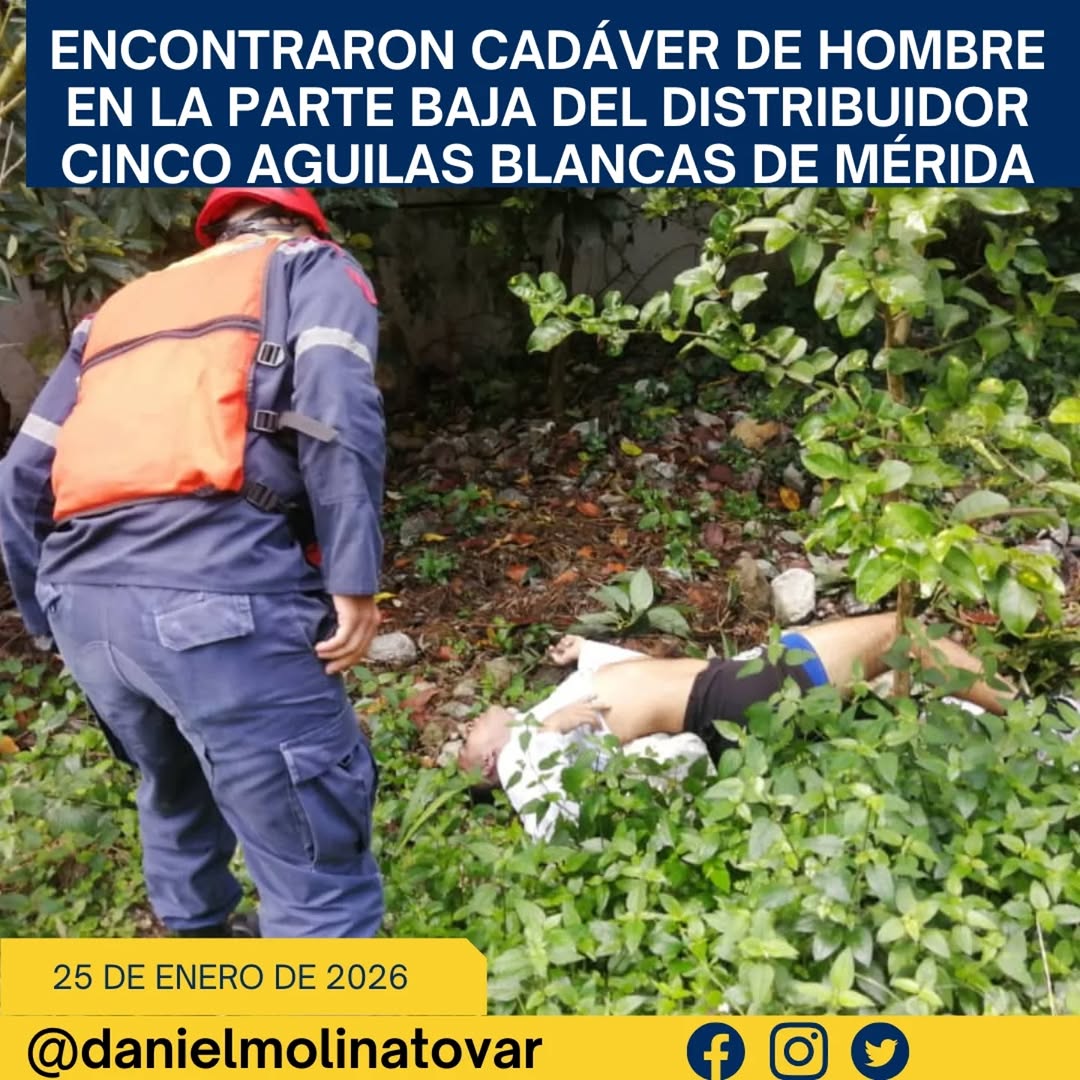 En horas de la mañana de este domingo 25 enero de 2026, fue localizado el cadáver de un hombre de aproximadamente 20 años de edad, en los alrededores de la infraestructura del distribudor Cinco Águilas Blancas, parroquia Juan Rodríguez Suarez, municipio Libertador del estado Mérida.