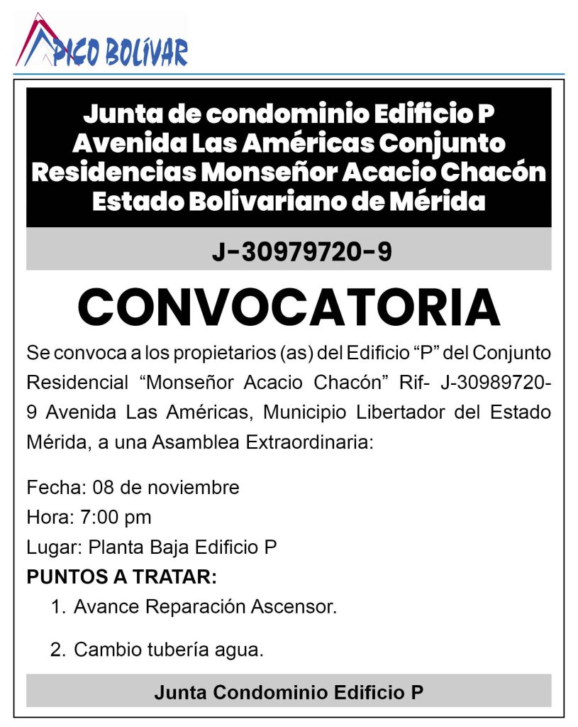 Home Avisos Legales La Junta de Condominio del Edificio “P” del Conjunto Residencial “Monseñor Acacio Chacón”convoca a todos los propietarios y propietarias del edificio a una Asamblea Extraordinaria