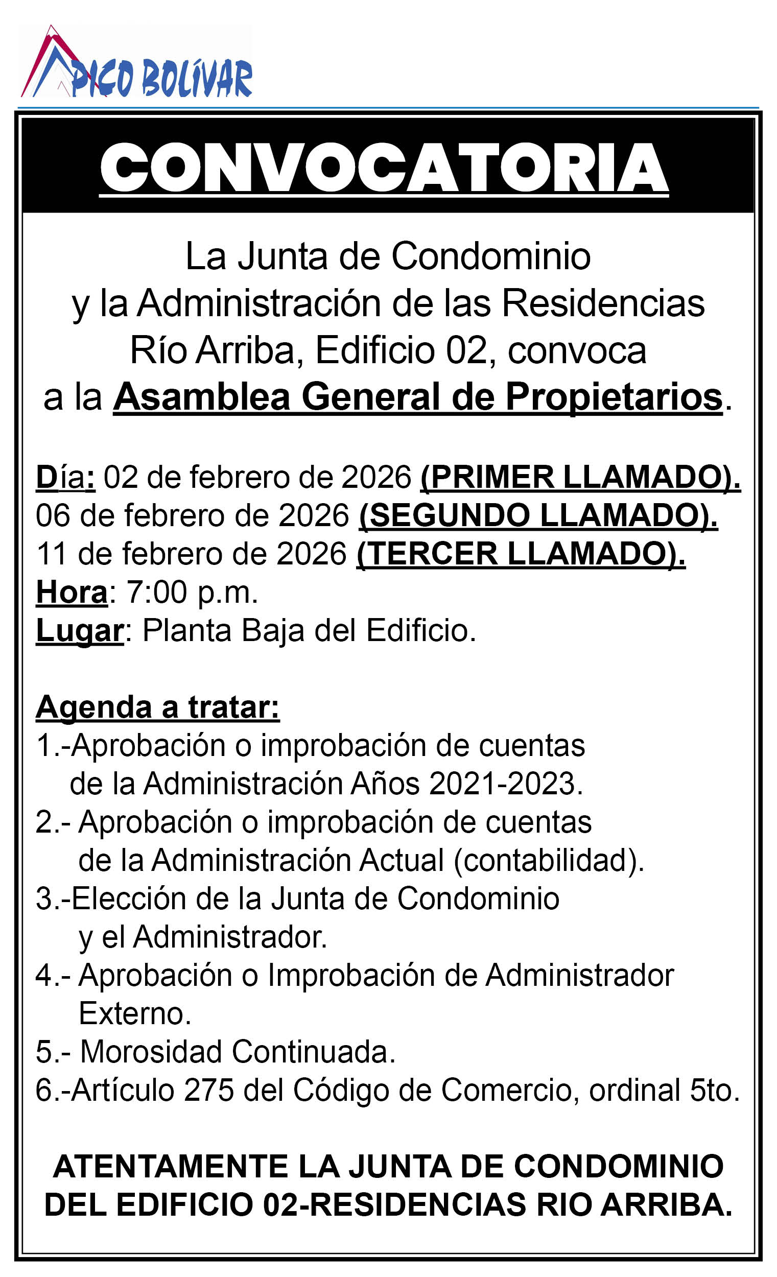 110 0 comentarios 0 FacebookTwitterPinterestEmail Redacción web publicación anterior CARTEL DE CITACIÓN Al ciudadano CESAR ALFONSO CONTRERAS GRIMALDO titular de la cédula de identidad N• 26.259.587 publicación siguiente Aviso importante: convocatoria dirigida a empresas interesadas para la concesión del área de Restaurant – Fuente de Soda del Mérida Country Club (27, 28 y 29 de enero de 2026) Related Articles EDICTO: Se convoca a los herederos conocidos y... 13 de marzo de 2026 EDICTO. Se hace saber a los HEREDEROS DESCONOCIDOS... 13 de marzo de 2026 ASOCIACIÓN CIVIL MÉRIDA COUNTRY CLUB SEGUNDA CONVOCATORIA ASAMBLEA... 12 de marzo de 2026 CARTEL DE CITACION HACE SABER: A los ciudadanos:... 12 de marzo de 2026 EDICTO. Se hace saber A los HEREDEROS DESCONOCIDOS... 10 de marzo de 2026 Notificación dirigida al ciudadano Wistter Ernesto Sosa Ballestero,... 10 de marzo de 2026 Cartel de citación a la ciudadana YOLEIDY LILIANA... 10 de marzo de 2026 El impreso 9 de marzo de 2026 CARTEL DE INTIMACION HACE SABER: Al ciudadano ALI... 9 de marzo de 2026 Edicto. Se hace saber a los HEREDEROS DESCONOCIDOS... 9 de marzo de 2026