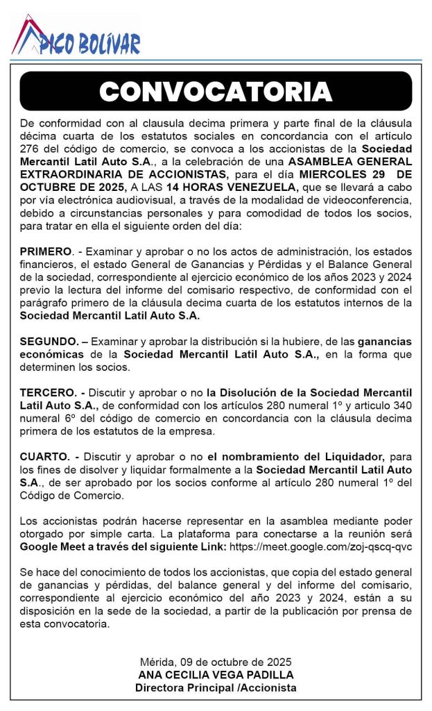 40 0 comentario 0 FacebookTwitterPinterestEmail Redacción web Seguir publicación anterior Convocatoria a Asamblea General Ordinaria de Copropietarios del Conjunto Residencial Las Gemelas 📍 Torres A y B – 🗓️ Viernes 17 de octubre de 2025 | 5:00 p.m. 📌 Lugar: Terraza de la Torre A publicación siguiente Cartel de notificación oficial — Circunscripción Judicial del Estado Mérida Tribunal Primero de Municipio Ordinario y Ejecutor de Medidas de los municipios Campo Elías y Aricagua Cartel de notificación oficial — Expediente N.° 4688 — Rectificación de acta de nacimiento N.° 530 (1978) Solicitante: Danny Daniel Rangel Zapata.(10-10-2025) Related Articles CARTEL DE CITACIÓN Al ciudadano: JOSE LUIS MONCAYO... 18 de octubre de 2025 Cartel de Citación a la ciudadana, BLANCA MAYIRA... 17 de octubre de 2025 CARTEL DE NOTIFICACIÓN al Ciudadano ALEXANDER JOSÉ MIERES... 17 de octubre de 2025 CARTEL DE CITACIÓN al ciudadano ORLANDO JAVIER VENEGAS... 17 de octubre de 2025 CARTEL DE CITACIÓN Al ciudadano: JOSE LUIS MONCAYO DELGADO,... 14 de octubre de 2025 Notificación de Disolución de Unión Estable de Hecho 14 de octubre de 2025 Cartel de Citación a la ciudadana Blanca Mayira Moreno Gamez,... 13 de octubre de 2025 CARTEL DE NOTIFICACIÓN Al ciudadano RICHARD MORALES, titular... 11 de octubre de 2025 Cartel de notificación oficial — Circunscripción Judicial del... 10 de octubre de 2025 Convocatoria a Asamblea General Ordinaria de Copropietarios del... 10 de octubre de 2025