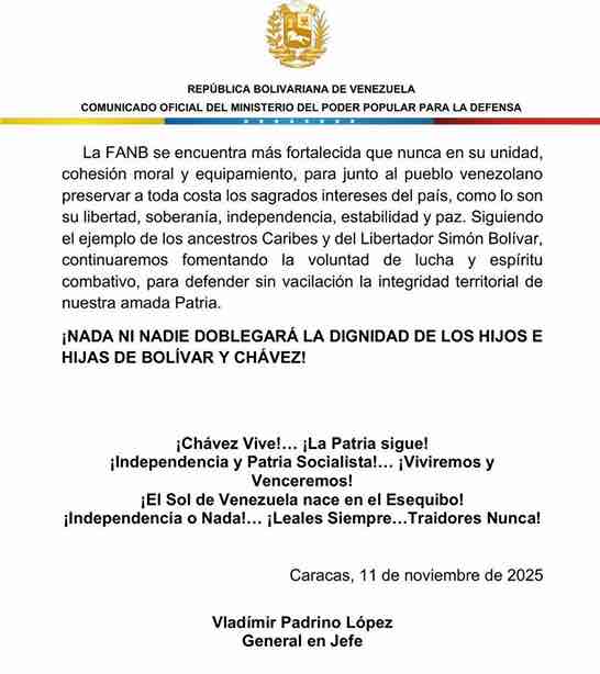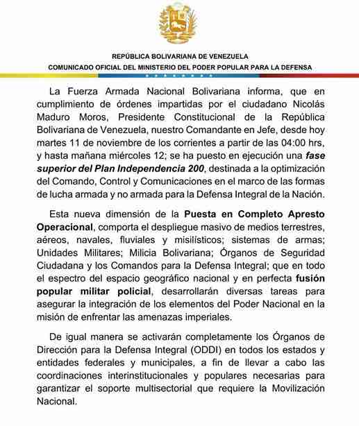 El ministro de la Defensa y General en Jefe de la Fuerza Armada Nacional Bolivariana, Vladimir Padrino López,ha emitido un comunicado en el cual informa de que se han elevado los niveles de alerta militar en el país, en cumplimiento, se lee en la nota