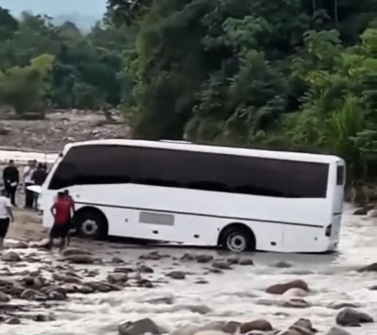La mañana de este sábado 14 de febrero, una unidad de transporte público quedó atrapada en medio de las aguas en la variante del río Arenoso, específicamente de la vía nacional Troncal 001, jurisdicción del municipio Tulio Febres Cordero.