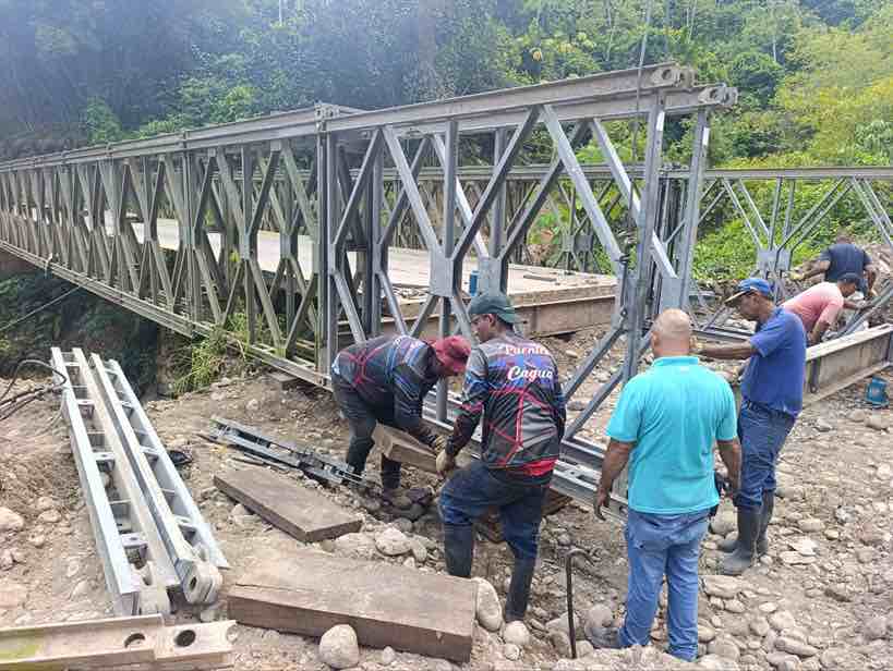 Los trabajos correctivos de esta importante vialidad que realiza el Ministerio de Transporte en articulación con la Gobernación del estado Mérida, se iniciaron ayer jueves cuando personal de Puentes Cagua empezó con las labores de instalación de una sesión de puente adicional a la infraestructura con el obietivo de ampliar la longitud del puente y contar con espacio en terreno firme. /Catarine Castro CNP. 8.962