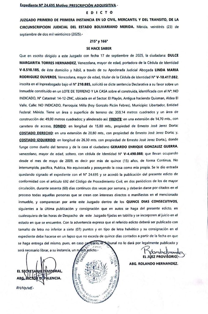 PRESCRIPCIÓN ADQUISITIVA – EDICTO Se hace saber que Dulce Margarita Torres Hernández solicita sentencia sobre un inmueble en El Playón, Mérida, actualmente poseído por Gerardo Enrique González Guerra desde 2009. Interesados deben comparecer ante este Juzgado dentro de quince (15) días de la última publicación. (05-01-2026)