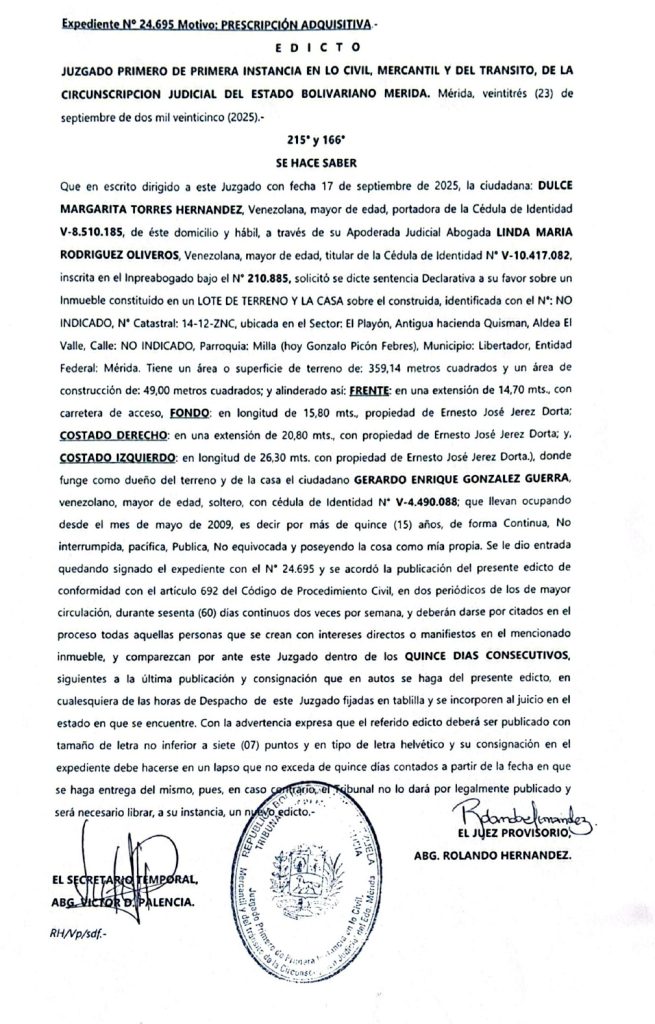 PRESCRIPCIÓN ADQUISITIVA – EDICTOSe hace saber que Dulce Margarita Torres Hernández solicita sentencia sobre un inmueble en El Playón, Mérida, actualmente poseído por Gerardo Enrique González Guerra desde 2009. Interesados deben comparecer ante este Juzgado dentro de quince (15) días de la última publicación.