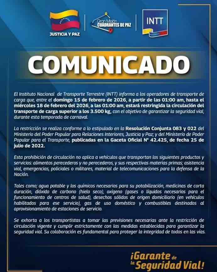El INTT informa que por el asueto de Carnaval se restringe la circulación de vehículos con peso superior a los 3.500
