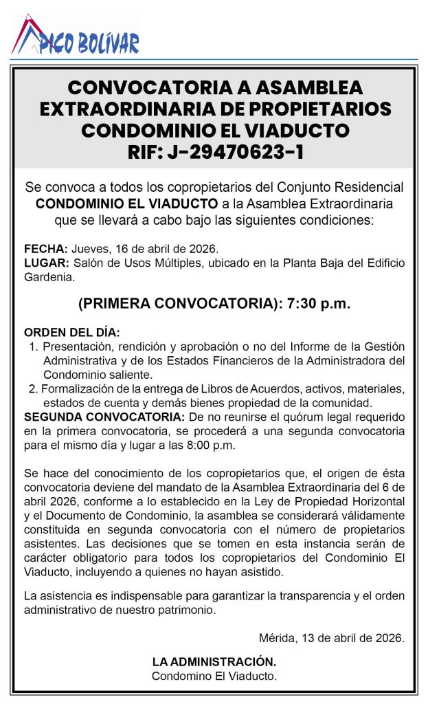 Se convoca a todos los propietarios del Conjunto Residencial CONDOMINIO EL VIADUCTO a la Asamblea Extraordinaria que se llevará a cabo el Jueves, 16 de abril de 2026 en el Salón de Usos Múltiples, ubicado en la Planta Baja del Edificio Gardenia
