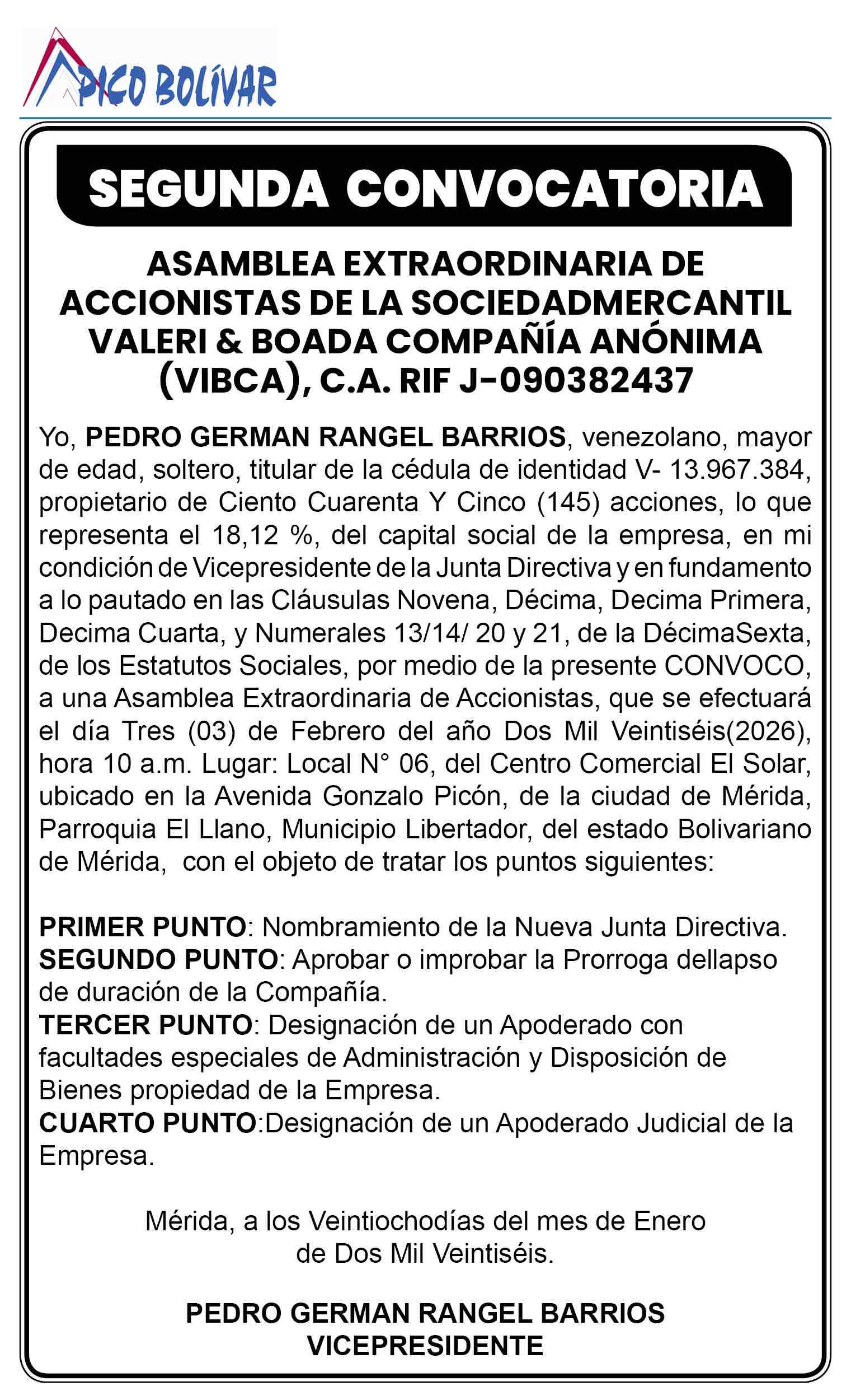 Avisos Legales Segunda Convocatoria Asamblea Extraordinaria de Accionistas Valeri & Boada Compañía Anónima (VIBCA), C.A. – RIF J-090382437 Martes 03 de febrero de 2026 · 10:00 a.m. · C.C. El Solar, Local N° 06, Mérida por Redacción web 28 de enero de 2026 escrito por Redacción web 28 de enero de 2026 35 0 comentarios 0 FacebookTwitterPinterestEmail Redacción web publicación anterior Convocatoria a Asamblea General Extraordinaria Condominio Edificio Torre de Los Andes Sábado 31 de enero de 2026 – 4:00 p.m. publicación siguiente Cartel Se Hace Saber Solicitud de Rectificación de Acta de Nacimiento Promovida por el ciudadano Juan Andrés Contreras Avendaño En interés de Niño, Niña o Adolescente (LOPNNA) Related Articles Convocatoria a Asamblea General Ordinaria de Copropietarios del... 30 de enero de 2026 Convocatoria a Asamblea General de Accionistas de S.A.... 30 de enero de 2026 Cartel Se Hace Saber Solicitud de Rectificación de Acta... 28 de enero de 2026 Convocatoria a Asamblea General Extraordinaria Condominio Edificio Torre... 28 de enero de 2026 EDICTO. Se hace saber a todas aquellas personas... 26 de enero de 2026 EDICTO. Se hace saber a los herederos conocidos... 26 de enero de 2026 Edicto: Se hace saber a las personas interesadas... 24 de enero de 2026 Aviso importante: convocatoria dirigida a empresas interesadas para... 24 de enero de 2026 La Junta de Condominio y la Administración de... 23 de enero de 2026 CARTEL DE CITACIÓN Al ciudadano CESAR ALFONSO CONTRERAS... 22 de enero de 2026