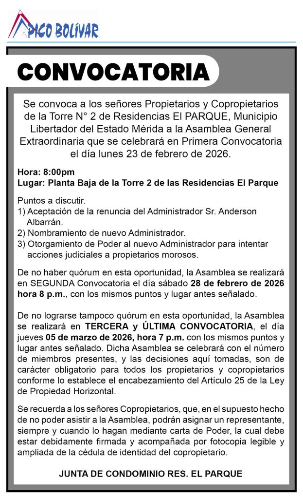 Tercera y Última Convocatoria a Asamblea General Extraordinaria de Propietarios y Copropietarios de la Torre N.º 2 de Residencias El Parque – Jueves 05 de marzo de 2026 – 7:00 p.m. – Planta Baja de la Torre 2. Dicha Asamblea se celebrará con el número de miembros presentes, y las decisiones aquí tomadas, son de carácter obligatorio