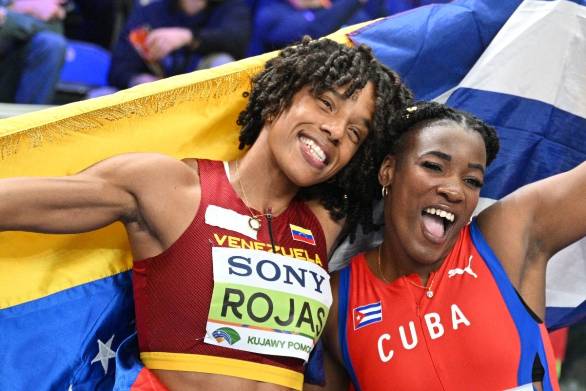 La venezolana Yulimar Rojas (izquierda), segunda clasificada, y la cubana Leyanis Pérez Hernández, primera clasificada, celebran al término de la final de triple salto femenino durante el Campeonato Mundial de Atletismo en Pista Cubierta Kujawy Pomorze 2026 en Torun, Polonia, el 21 de marzo de 2026. Foto: Andrej ISAKOVIC / AFP